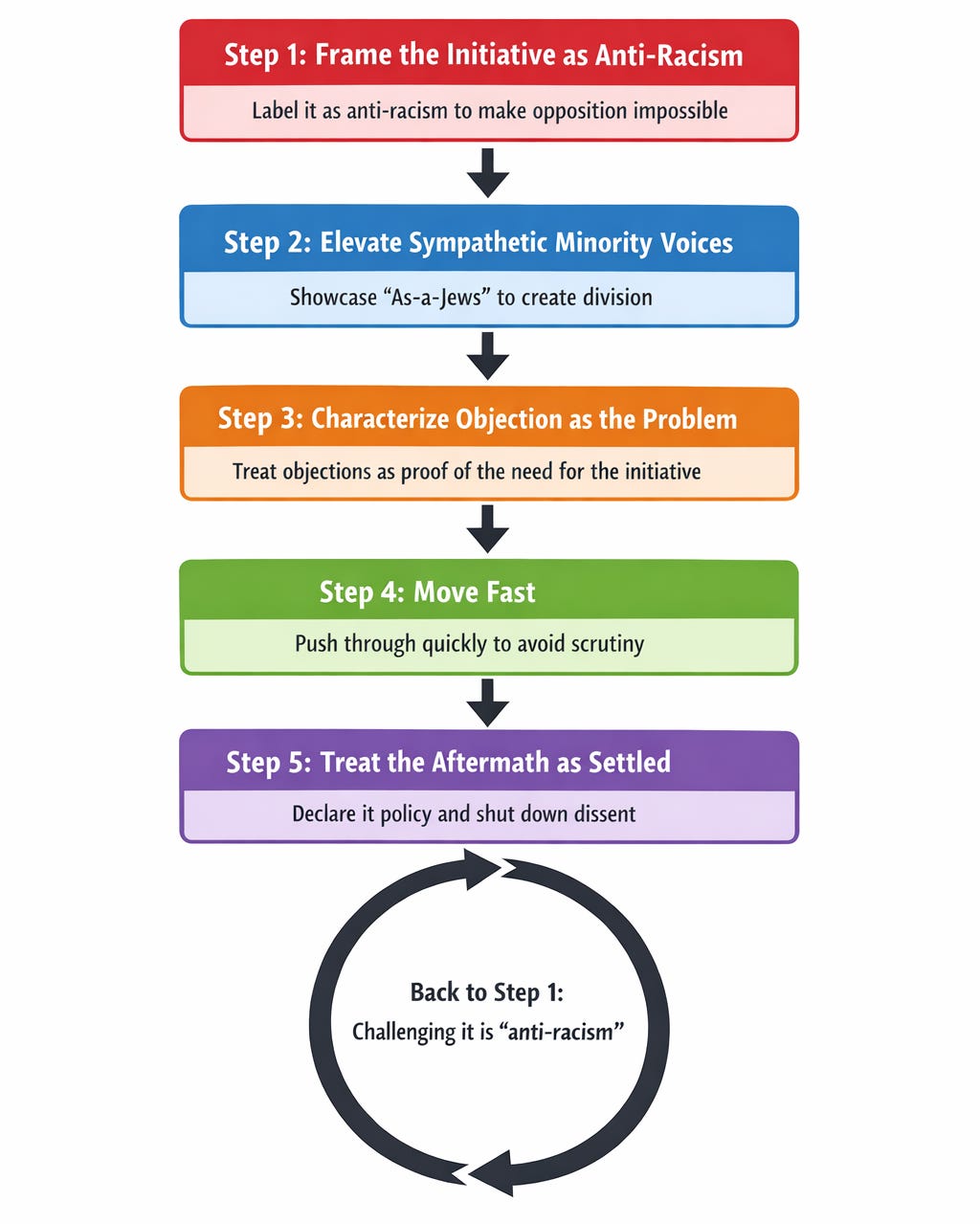 Step five: Treat the aftermath as settled. Once the vote passes, it becomes policy. Once it is policy, challenging it becomes challenging anti-racism, which brings us back to step one.