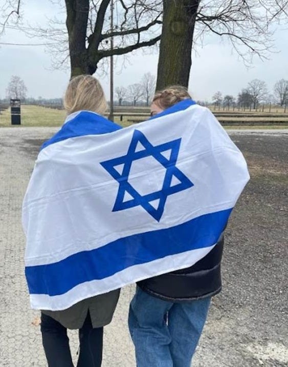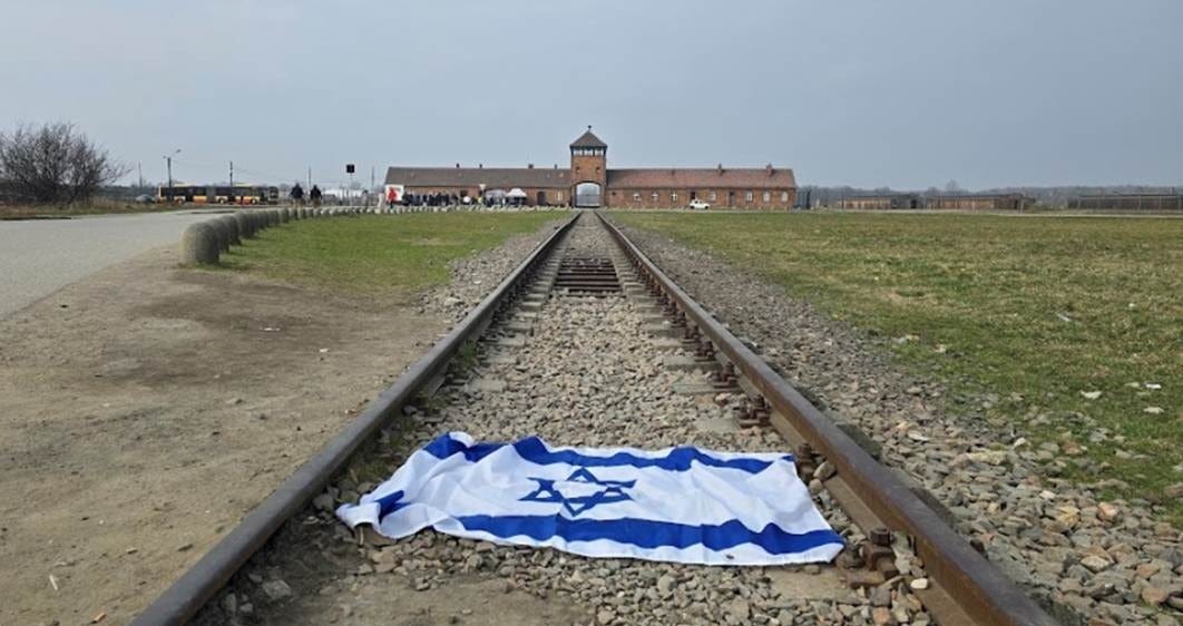 There is a photo from this trip of a flag lying across the train tracks leading into Birkenau, a symbol of a present that exists because of a past that almost erased it. There is another of students wrapped in that same flag, walking forward, not away from history, but through it, carrying it.