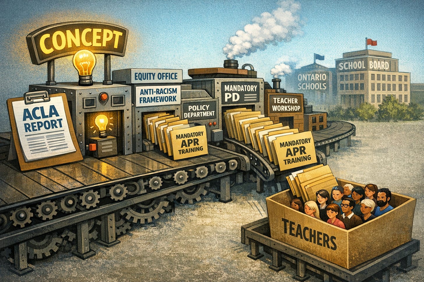 Infrastructure. Canadian public institutions, particularly school boards, had already built the machinery for this kind of adoption. They had equity offices. They had anti-racism frameworks. They had mandatory training pipelines. They had complaint mechanisms. They have teachers who are required to attend professional development meetings. They had the bureaucratic architecture to receive a new category of discrimination and plug it directly into existing systems. The ACLA didn’t need to build anything, it just needed to provide a concept. The conveyor belt was already running.
